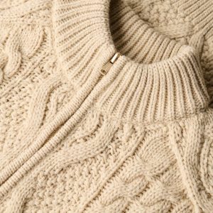 - Cable knit fabric and a small signature tab on the back neckline