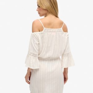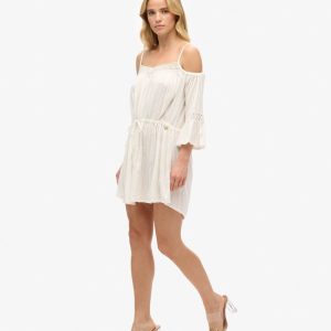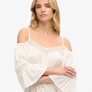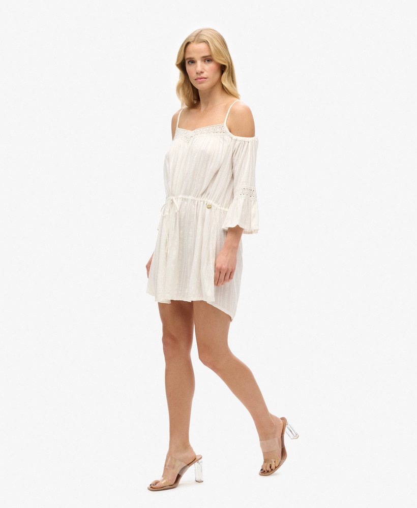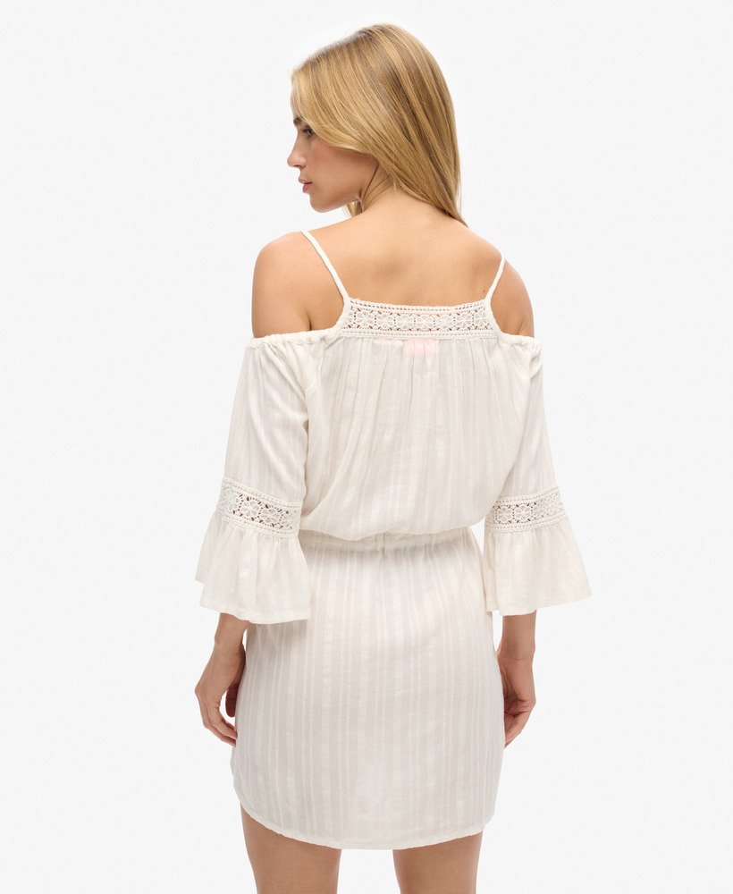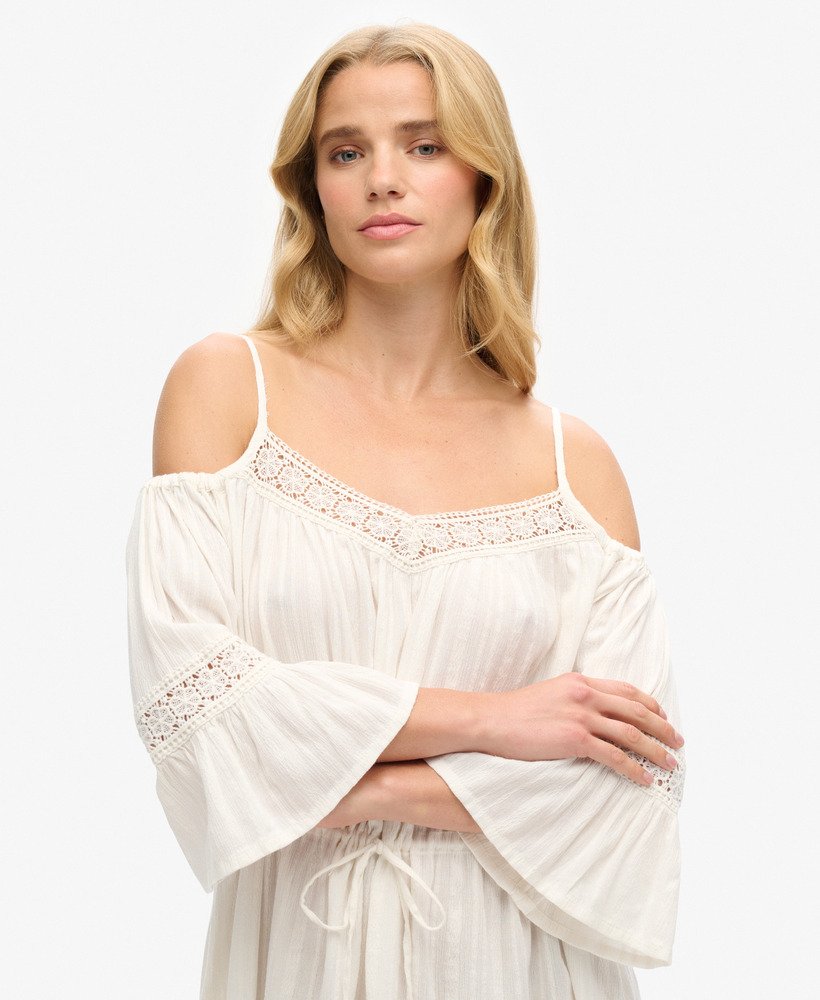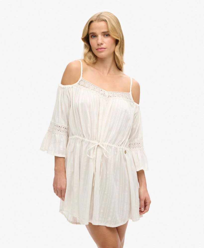 Channel that free-flowing style into your outfit with our Cold Shoulder Mini Dress. The loose fit creates an authentic silhouette, one that you can adjust to suit your comfort and style with its drawstring waist. Cold shoulders elevate the style and enhance that bohemian carefree look, whilst the lace detailing adds a delicate touch. Whether you’re layering it over a bikini or getting ready for a sunny brunch, this dress is an ideal choice.