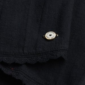 - Signature metal tab on the hemline