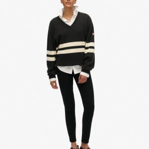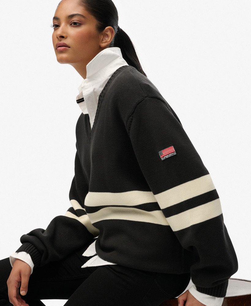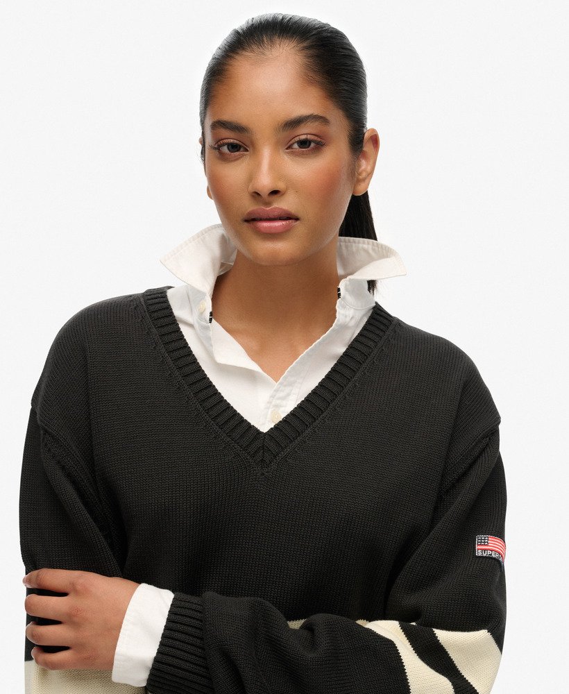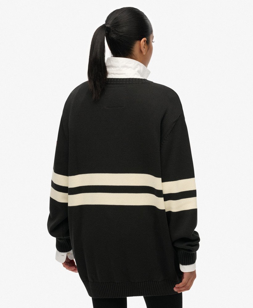 The Oversized Striped V-Neck Jumper is an elegant option for cosy days. Designed with an eye-catching stripe across the chest and a V-neckline, we’ve elevated the everyday knitted jumper to allow you to style and layer it throughout the seasons for a versatile, chic look.