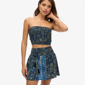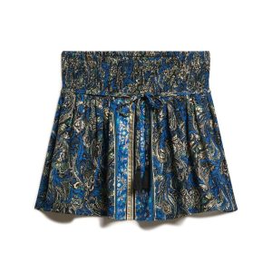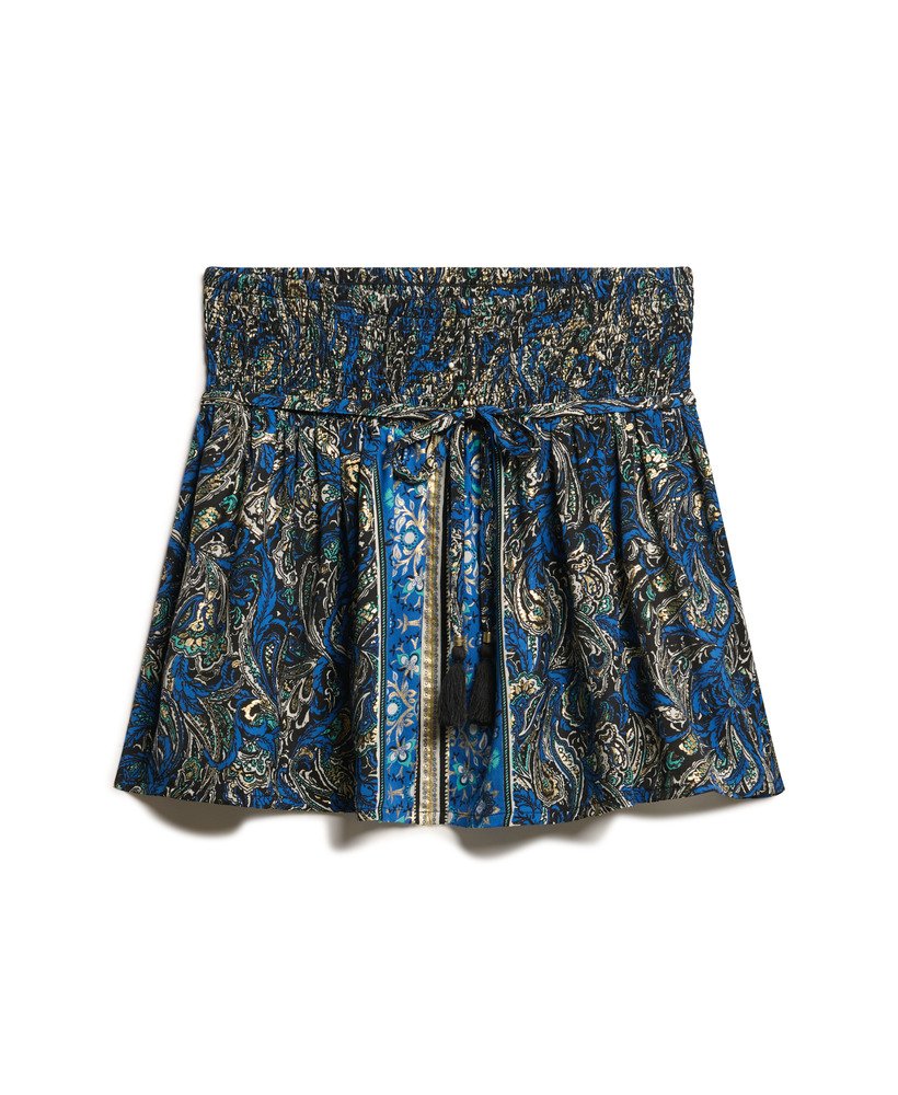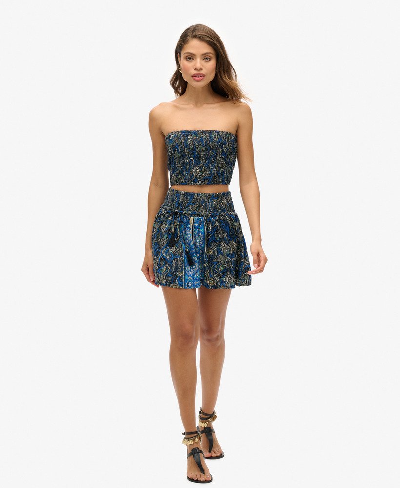 Elevate your summer wardrobe with the Paisley Print Mini Skirt, a chic reimagining of an iconic style. The smocked waistband keeps things comfortable and easy, while the low-slung skinny belt and sophisticated print ensures your style stays on trend, a perfect combo for either day or night.