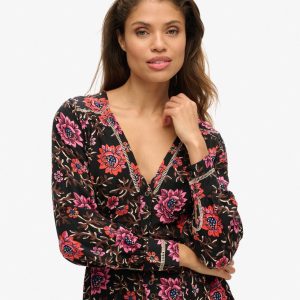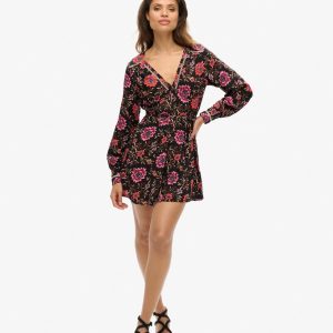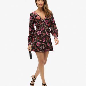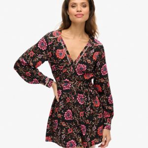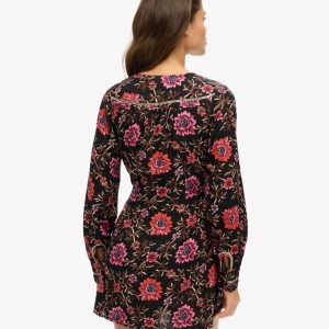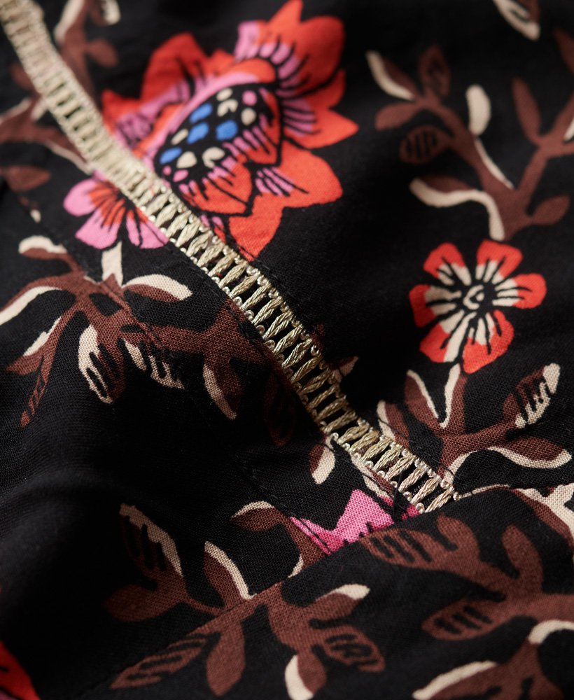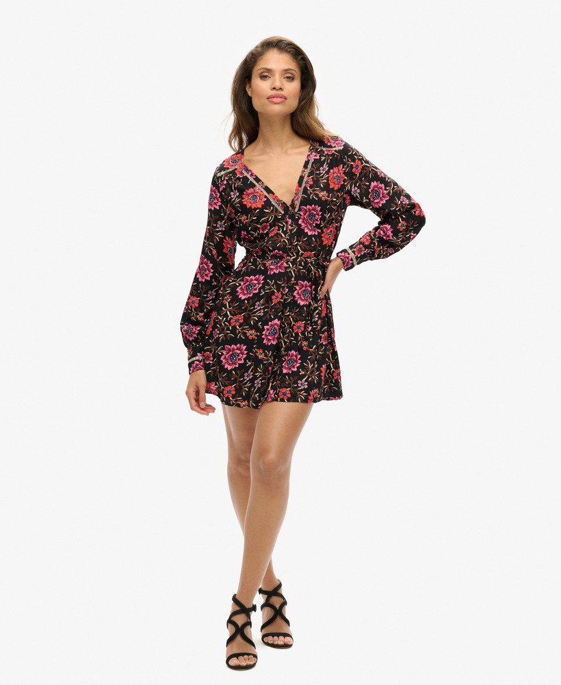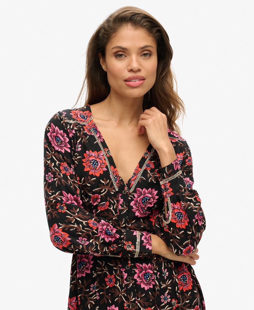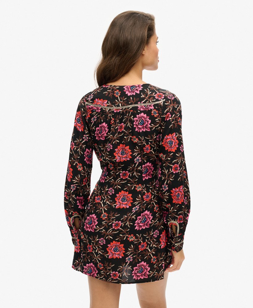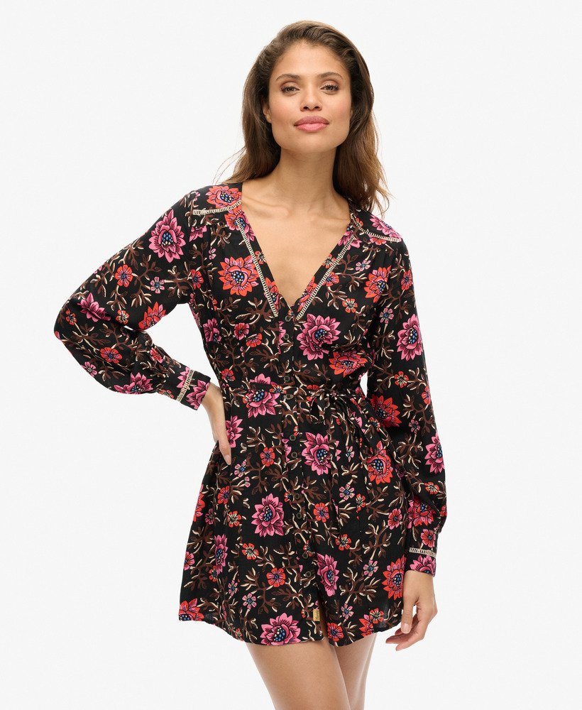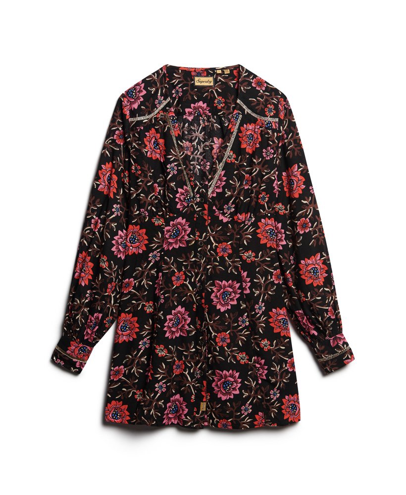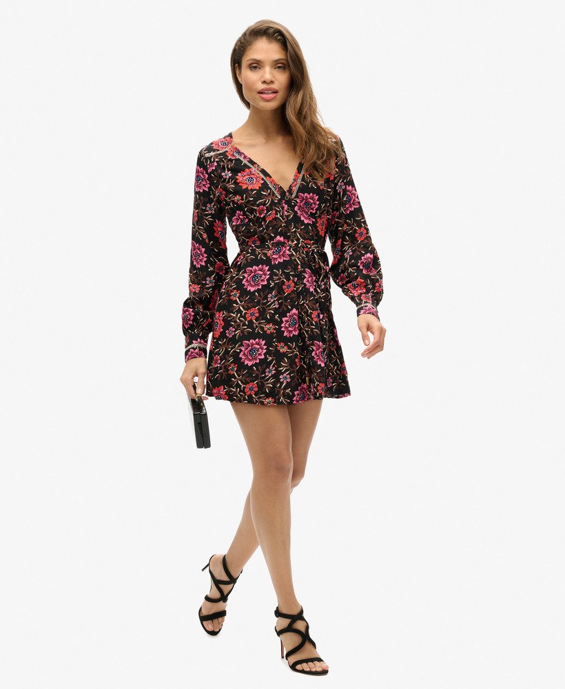 Drawing on the influence of the classic tea dress style that was popularised in the mid-20th century, the V-neck mini tea dress will bring added elegance to your wardrobe. The soft and flowing fabric in a floral print means this piece is not only great to wear but also perfect to mix and match. Finished with vintage-style buttons and intricate metallic thread detailing, the V-neck mini dress will surely become one of your wardrobe favourites.