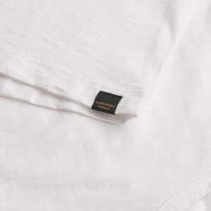 - Small signature tab on the hemline.